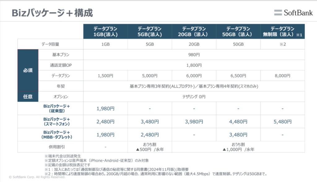 法人・個人事業主の方だけが利用できる「Bizパッケージ+」なら、キャリアの安定した品質はそのままに、驚きの価格でスマホを利用できます 。